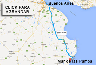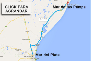 Distancia de Buenos Aires a Mar de las Pampas 359 Km. Autopista Buenos Aires –La Plata, Cruce Autovía 2 y RP 36 (Km 44).Se sigue por Autovía 2 pasando por Chascomús ( Km 108), Castelli ( Km 169), luego subiendo un puente doblando a la izquierda se toma la Ruta Provincial 63( Km 193) Dolores hasta el cruce de la Ruta Provincial 11 Esquina de Crotto ( 29 Km), se dobla a la derecha por ruta 11 hasta General Conesa(Km 248)donde se bifurca tomar Ruta Provincial 56 hasta General Madariaga (Km 62), girando la rotonda a la izquierda Ruta Provincial 74 (km 20) hasta Pinamar,doblando a la derecha Ruta Provincial 11 hasta Mar de las Pampas ( km 420), pasando por Ostende, Valeria del Mar , Cariló , de Villa Gesell , entrada doblar a la izquierda.