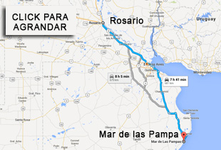 Autopista AU-12 (16 Km), hasta Ruta Nacional 9 hasta desvío a Villa Constitución, se sigue por la Ruta Nacional 9 , pasando por San Nicolás (19 Km), San Pedro, Zárate, Campana (17 Km), Escobar, Cruce Ruta Nacional 9 y Ruta Nacional 8 (13 Km), Cruce Ruta Nacional 9 y Ramal Tigre (22 Km), Autopista Buenos Aires –La Plata, Cruce Autovía 2 y RP 36 (Km 44), Autovía 2,.Se sigue por Autovía 2 pasando por Chascomús ( Km 108), Castelli ( Km 169), luego subiendo un puente doblando a la izquierda se toma la Ruta Provincial 63( Km 193) Dolores hasta el cruce de la Ruta Provincial 11 Esquina de Crotto ( 29 Km), se dobla a la derecha por ruta 11 hasta General Conesa(Km 248)donde se bifurca tomar Ruta Provincial 56 hasta General Madariaga (Km 62), girando la rotonda a la izquierda Ruta Provincial 74 (km 20) hasta Pinamar,doblando a la derecha Ruta Provincial 11 hasta Mar de las Pampas ( km 420), pasando por Ostende, Valeria del Mar , Cariló , de Villa Gesell , entrada doblar a la izquierda.